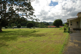 This is the extension of the Windward Community College Great Lawn onto Hawaii State Hospital Property. A corner of the Bishop Building is in the extreme right of the picture. Visualize a two story building extending down the slope to the makai road.The right curb is the boundary between the Windward Community College and the Hawaii State Hospital. The long term care facility will be built on the property on the right.